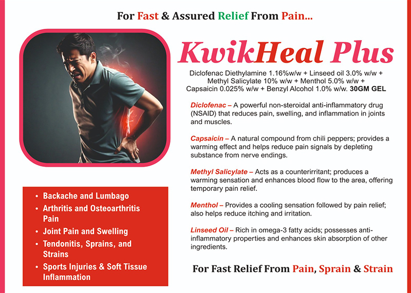 | KWIKHEAL PLUS GEL | DICLOFENAC 1.16% W/W + CAPSAICIN 0.025% W/W + METHYL SALICYLATE 10% W/W + MENTHOL 5% W/W + LINSEED OIL 3% W/W | 30 GM | View Catalog | View Product |