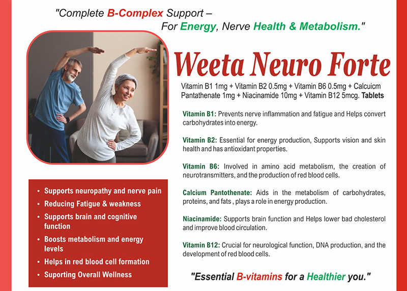 | WEETA NEURO FORTE Tab | VITAMIN B1 1MG + VITAMIN B2 0.5MG + VITAMIN B6 0.5MG + CALCUICM PANTATHENATE 1MG + NIACINAMIDE 10MG + VITAMIN B12 5MCG | 10*5*10 (Blister pack) | View Catalog | View Product |