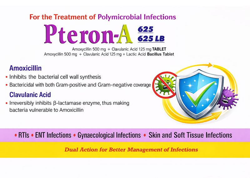 | PTERON-A 625 Tab. | Amoxycillin 500 mg. Clavulanic Acid 125 mg. | 6-T (Alu foil pack) | View Catalog | View Product |