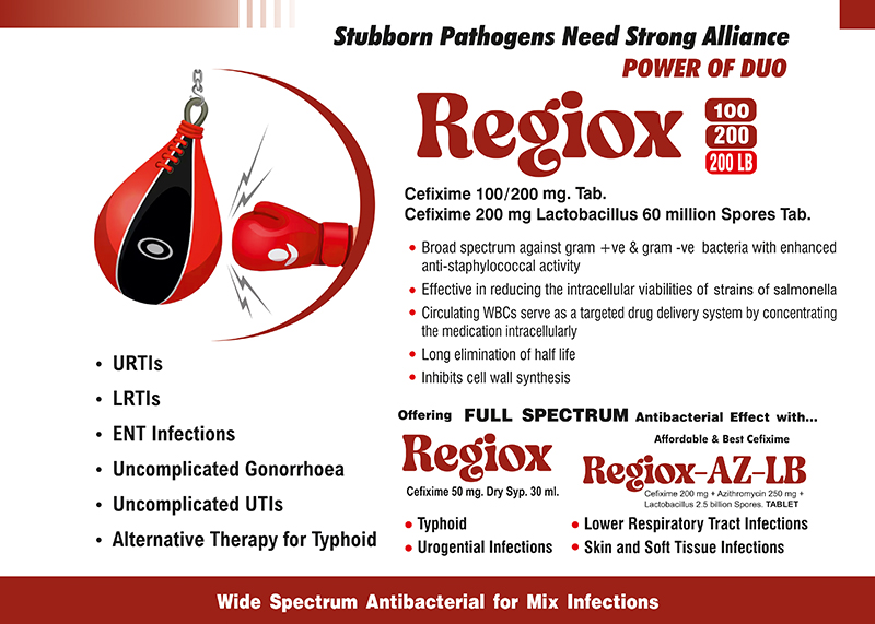| REGIOX-200 LB Tab. | Cefixime-200mg Lactobacillus 60 million Spores | 10-T (Alu Alu pack) | View Catalog | View Product |